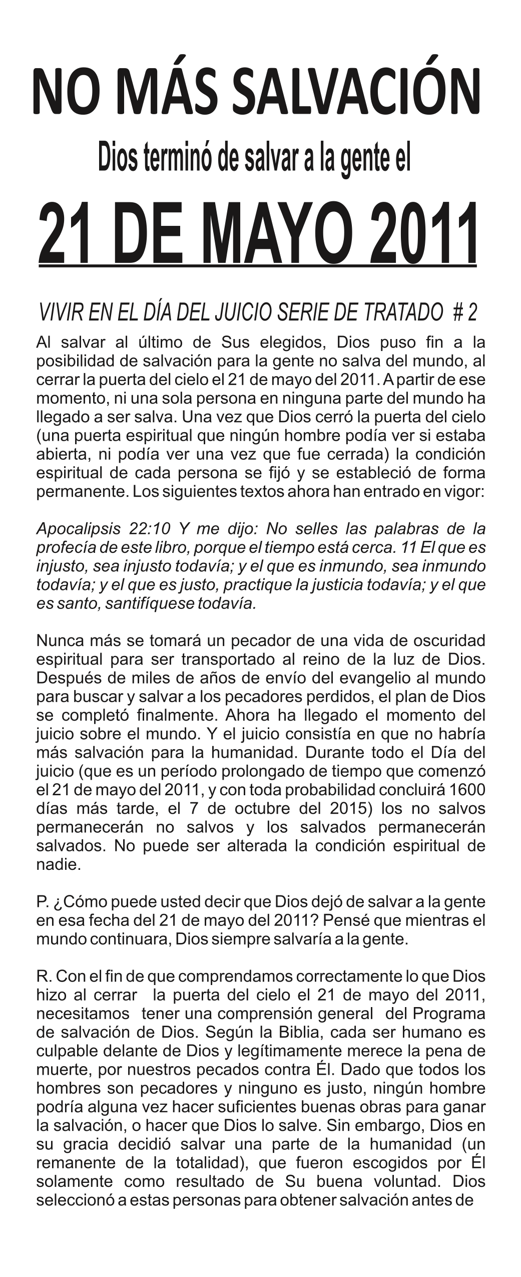 Después de salvar al último de Sus elegidos, Dios finalizó la posibilidad de salvación para las personas no salvas del mundo cerrando la puerta del cielo en mayo 21, 2011. A partir de ese momento en adelante, ninguna persona en cualquier lugar del mundo ha llegado a ser salva. Una vez que Dios cerró la puerta del cielo (una puerta espiritual que ningún hombre podría ver mientras estaba abierta: ni podría ver cuando fue cerrada) la condición espiritual de cada persona fue permanentemente fijada y establecida. Las siguientes Escrituras ahora toman efecto: