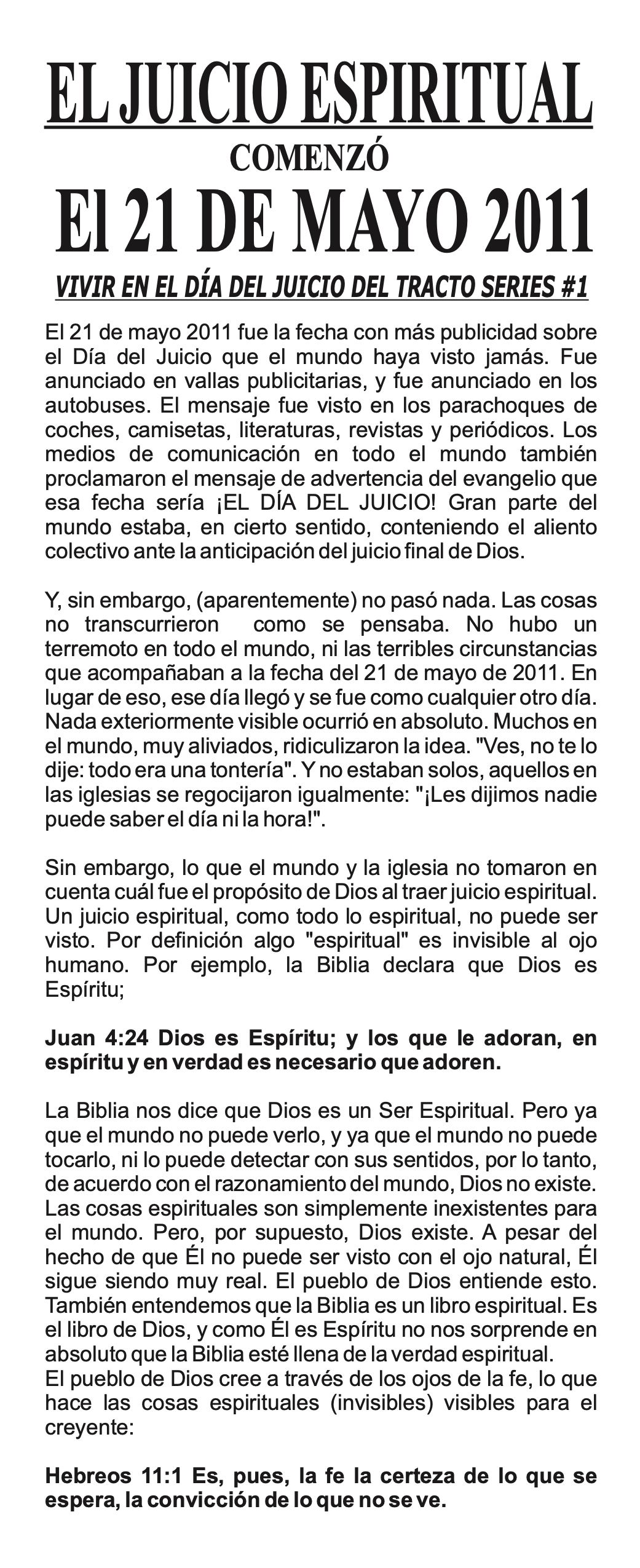 R. No. En realidad, la Biblia ha revelado el hecho de que el Día del Juicio ya ha llegado. ¿Quizás recuerdas haber oído sobre la fecha del 21 de mayo de 2011 proclamada al mundo hace varios años? La Biblia insiste en que esa proclamación fue correcta, esto significa que Dios ha estado juzgando al mundo desde aquel momento hasta ahora. Y la Biblia también indica que este período de juicio prolongado continuará por varios años más, muy posiblemente hasta el año 2033DC.