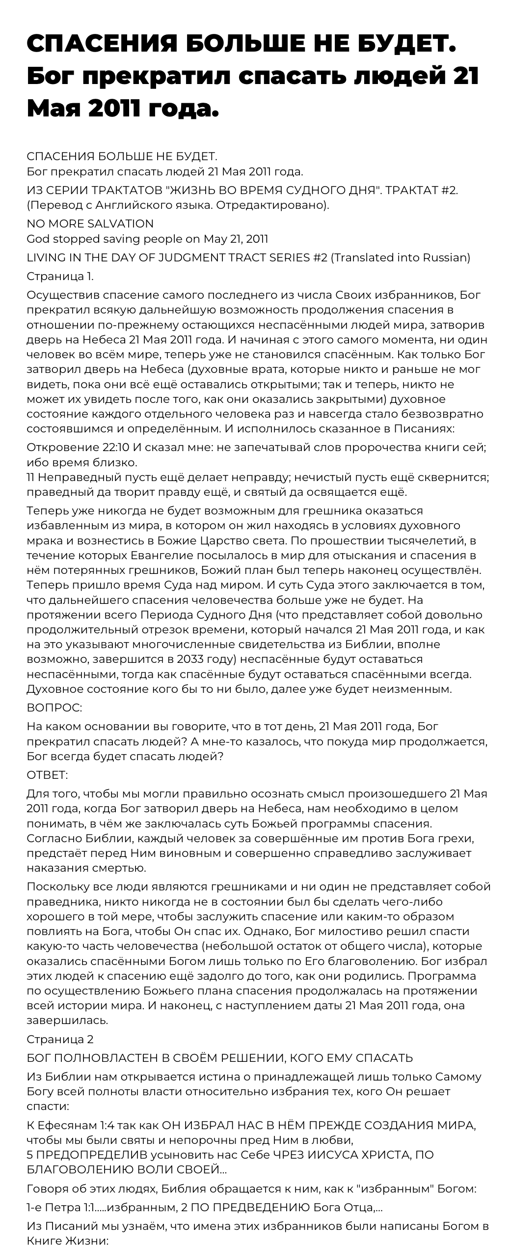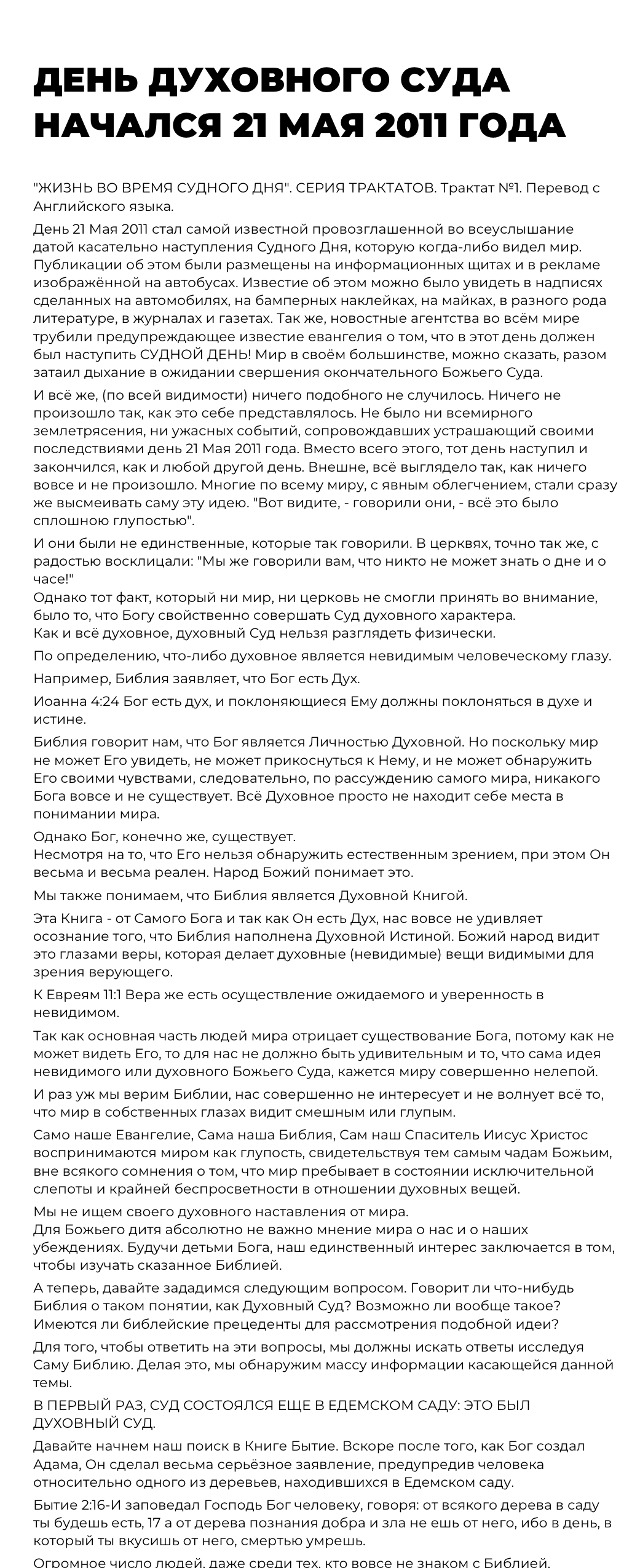 ИЗ СЕРИИ ТРАКТАТОВ "ЖИЗНЬ ВО ВРЕМЯ СУДНОГО ДНЯ". ТРАКТАТ #2. (Перевод с Английского языка. Отредактировано).