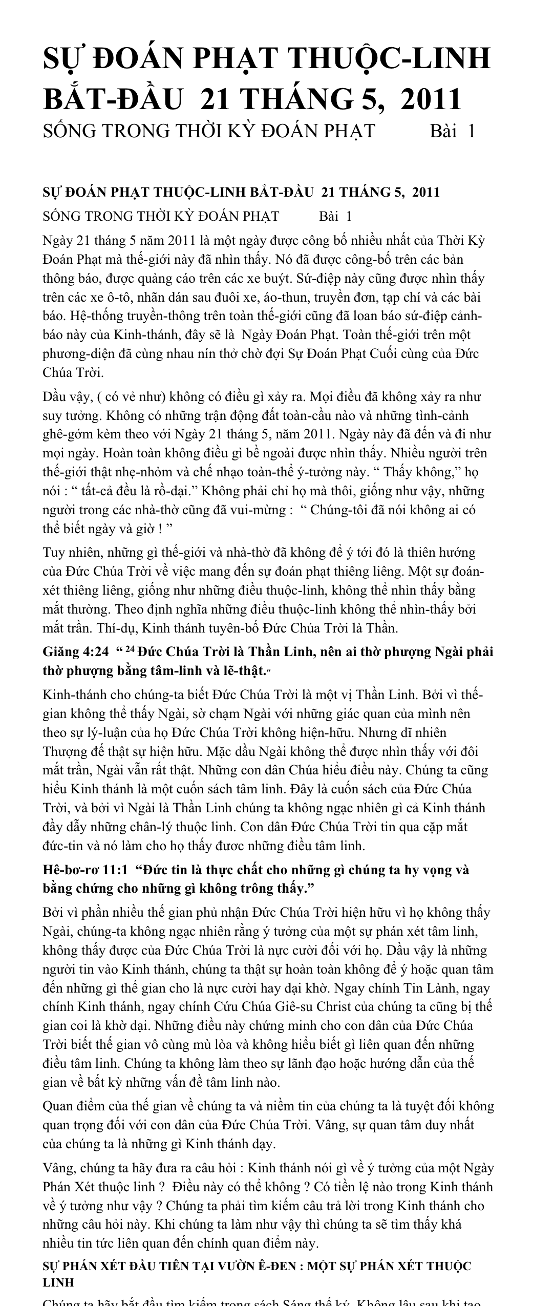 Nhưng câu hỏi lớn cho tất cả chúng ta trên thế-giới ngày hôm nay là : Đức Chúa Trời đã có giáng sự đoán phạt thuộc linh bắt đầu vào ngày 21 tháng 5 năm 2011 không ? Câu trả lời của Kinh thánh là : Có ! Có rất nhiều sự chứng-minh trong Kinh thánh cho câu nói rằng sự đoán phạt thuộc-linh đã bắt đầu vào ngày đó và tiếp-tục cho đến thời hiện tại.
