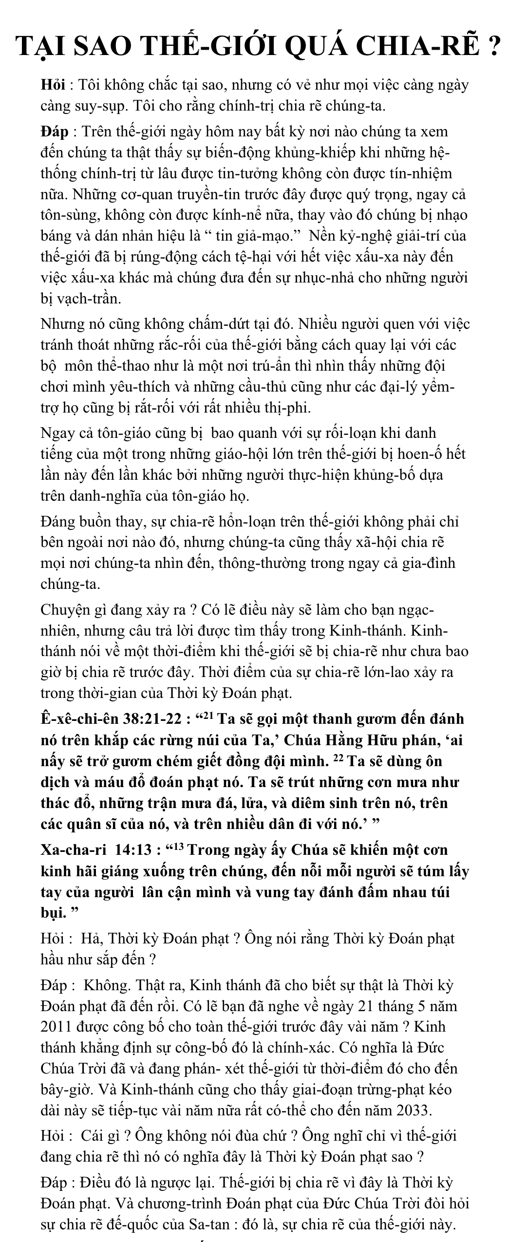Chuyện gì đang xảy ra ? Có lẽ điều này sẽ làm cho bạn ngạc-nhiên, nhưng câu trả lời được tìm thấy trong Kinh-thánh. Kinh-thánh nói về một thời-điểm khi thế-giới sẽ bị chia-rẽ như chưa bao giờ bị chia rẽ trước đây. Thời điểm của sự chia-rẽ lớn-lao xảy ra trong thời-gian của Thời kỳ Đoán phạt.